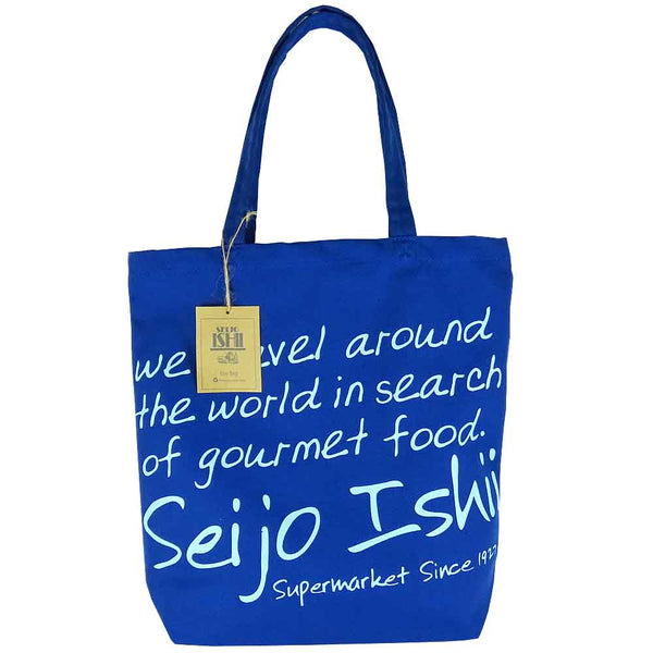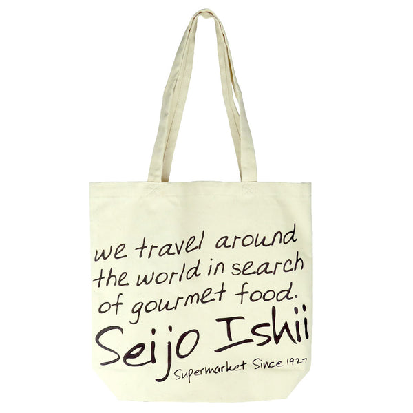 成城石井のオリジナルエコバッグには、英文をデザインしたプリントがしてあります。この英文は「私たちは美味しい食べ物を探すため、世界中を旅しています」と訳せます。世界中の美味しいものが集めそろえる、成城石井らしさあふれるおしゃれなテキストです。